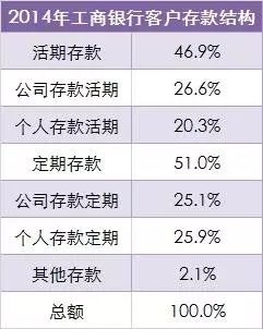 工商银行2014年的活期存款占全部存款的比例为46.9%。只管定期存款占比到达51%,但此中包罗了3个月和6个月期存款。