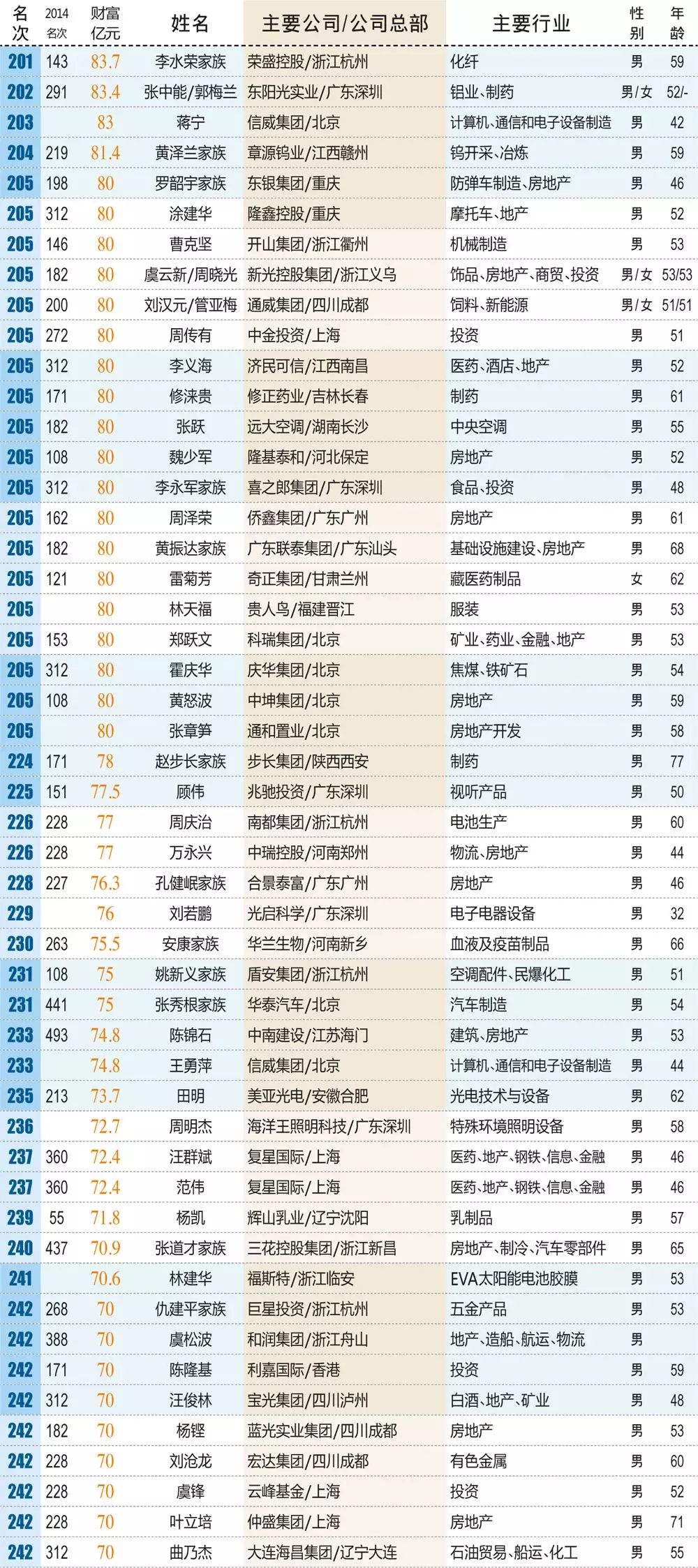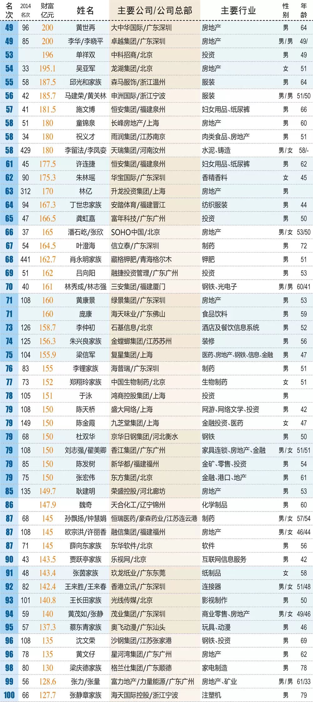 + x$ _) C5 c9 S 本年富人榜上的新面貌有82人,旗下有上市公司的有67位,此中来自中小板的有25人、创业板的有8人。新富人中,财产到达或高出百亿的有11人,蓝思科技的周群飞、中科招商的单祥双、海天味业的庞康不但分列上榜新富的前三甲,而且本年初次上榜便直接进入了榜单前100位,另一位直接杀入百富排名的黑马是天合化工的魏奇。" B* B) b. f' N0 T( |0 I