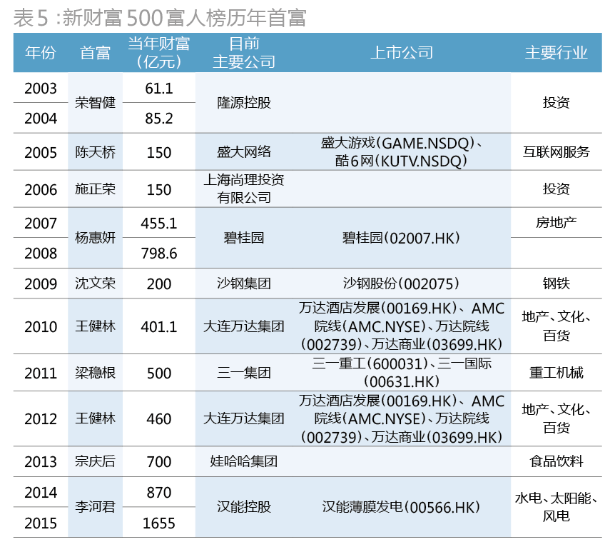, r+ b% C) R; W6 l 李河君旗下的汉能薄膜发电(00566.HK)2014年股价涨幅高达256%,2015年涨势更为凌厉,由年初的2.81港元/股上涨到3月5日的7.3港元/股,从而动员李河君的财产一起上扬。本年李河君以1655亿元的身家继续连任新财产500富人榜首富,他也是本榜推出以来第四位两次登顶首富的企业家,别的三位分别是隆源控股的荣智健、碧桂园的杨惠妍和大连万达的王健林(表5)。) K+ P- C$ V0 `4 p+ _8 S* v