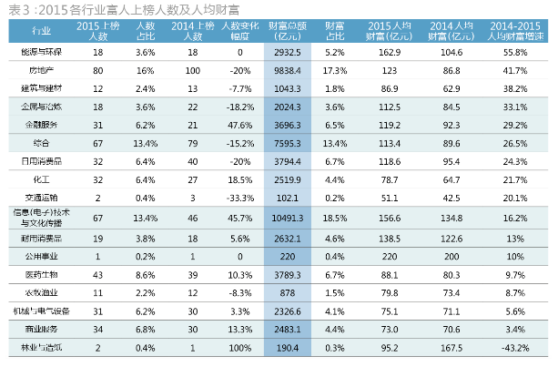 / b3 h; p/ M% b6 \$ k" [) e. z 从上榜富各人数看,来自房地产、TMT、综合、医药生物以及商业服务业的富人分列前五(表3)。和客岁差别的是,商业服务业的上榜人数取代属于制造财产的日用斲丧操行业,挤进了前五。这一变革的配景是,2013年起,中国第三财产增长值已经高出第二财产,2014年,终极斲丧对GDP的贡献率高出投资4个百分点,中国经济正从要素驱动、投资驱动转向斲丧驱动、创新驱动。