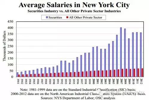/ ^/ |- s0 W" C" i4 Y* g1 s" l上图是纽约差别行业的汗青均匀工资,赤色是其他全部民营行业,紫色是证券行业。汗青趋势表现实体经济雇员的收入增长迟钝,而证券业则很快,末了差别越来越大。8 V; J! x: g* j' A