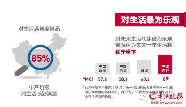 . B* g1 T& l2 D4 z3 o7 G那么,这些月入4.5万的中产家庭生存的怎样呢?数据表现他们广泛比力自负,85%的人很满足当前的生存。同时,在受访北亚区中,中国当地中产阶级对未来生存预期也最为乐观,他们广泛以为他们未来一年的生存将优于当下。5 q% U7 T- b; w) h8 Z- N7 f1 N
