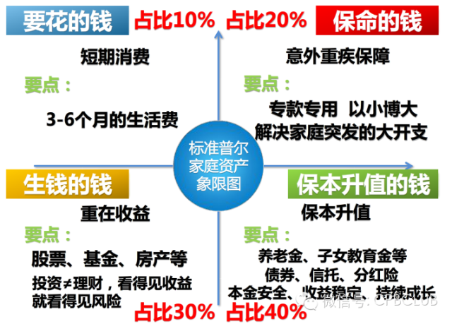 尺度普尔(standard & Poor’s)为举世最具影响力的光荣评级机构,专门提供有关光荣评级、风险评估管理、指数体例、投资分析研究、资料处置惩罚和代价评估等告急资讯。尺度普尔曾调研举世十万个资产妥当增长的家庭,分析总结出他们的家庭理财方式,从而得到尺度普尔家庭资产象限图。此图被公以为最公道妥当的家庭资产分配方式。