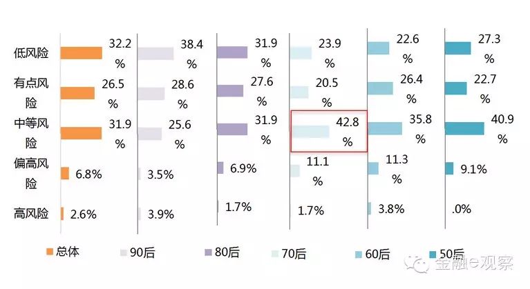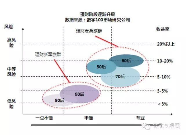 & `; T5 P: w* A作为理财的新军,80、90后人群已经开始理财,他们的资产较为单薄,但这并不影响他们理财的态度,他们敢于实行新型理财方式,也有着冒险的精力,而对于50、60、70后的理财老兵们,他们理财多年,也有资源,并能负担高风险。
