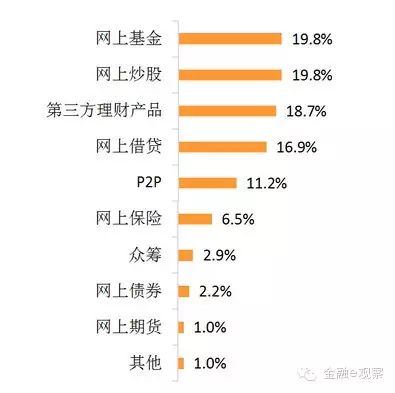 8 @, q) r3 L# D, x观察表现,第三方理产业品在公众心中的职位日益突显,上风显着。从认知度上看,在互联网金融中,网上基金、网上炒股及第三方理产业品的认知度较高,分别占比19.8%和18.7%,高出1成的受访者对于网上借贷、P2P的互联网理财方式也有肯定的认知度。别的,网上保险、众筹、网上债券期货等也有一小部门人对此体现相识。由此可见,第三方理产业品作为新兴理财本领,迎合了全新的理财理念,并得到投资者的青睐。5 ^: J% r1 J! y9 z w