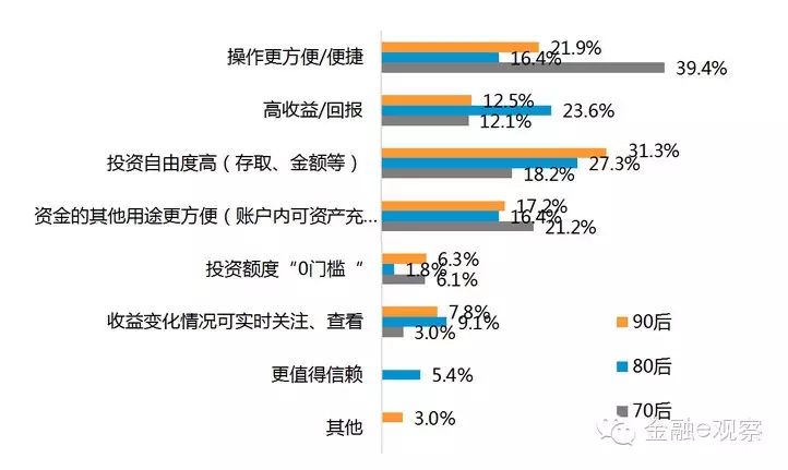 从群体细分上看,70后理财举动趋向稳固、恒久化,看重理财利用的便捷性;80后资金增长与个人抗风险本领较强,对收益较为看重;而90后由于收入偏低、资金稳固性差,因此最为关注投资的自由度。可见,互联网理财影响因素随着年事的厘革存在较大差别性。