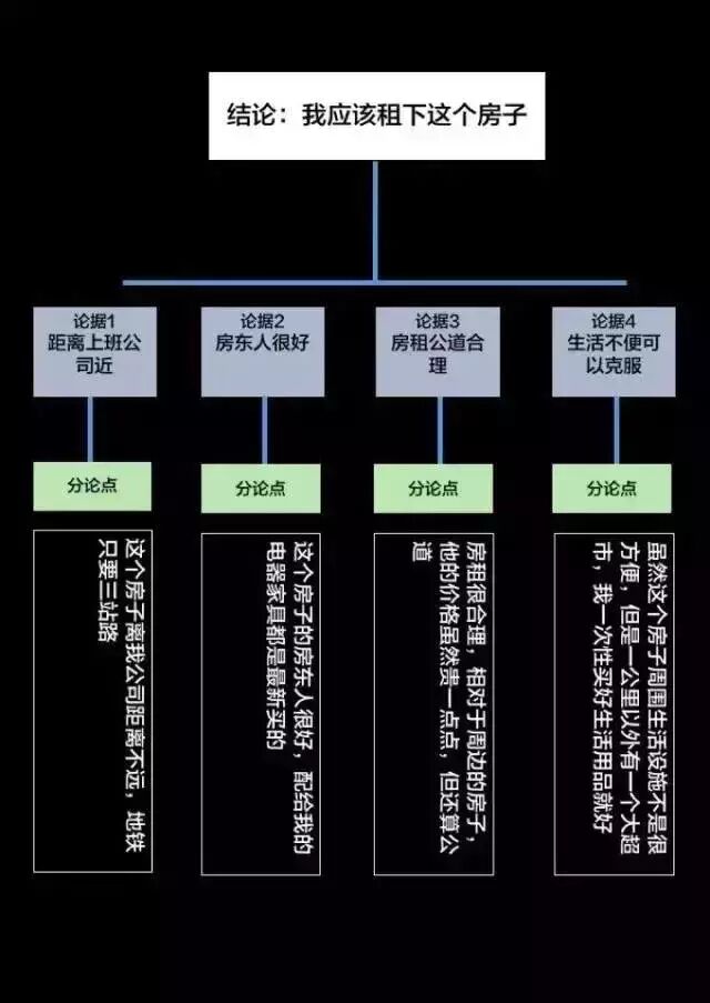 记着按照总分总的原则,起首抛出核心观点,即“我们应该做什么”。这大概是几句话,但是这几句话凝结了你大量的思考,泯灭了你大量的时间去考据和分析。当论述完核心观点之后,接下来必要举行表明,即“为什么这么做”。就像写论文一样,起首是核心论点,接下来是支持核心论点的分论点,然后是二级分论点,依次向下分列。如下图所示: “演绎归纳和MECE”,是你的分析思考过程;“先讲结论”,是你思考完以后的表述方法。先讲结论的人,可以或许在一开始就捉住别人的注意力,接下来通过层层递进的方式论证结论的精确性,听众就不会迷失方向。这种例子在一样平常工作中触目皆是。比如:结论:我应该转行去做贩卖论据:起首,现在这份工作收入不高,在一线都会生存比力吃力(经济收入低)。其次,如今这份工作是文职工作,每天坐在办公室处置处罚文件,和人打仗的时机较少,不得当我性格(主观缘故原由)。第三,我渴望将来可以或许做一些更有寻衅性的工作,如允许以或许资助我快速发展。而贩卖,无疑优劣常具备寻衅性的,固然工资不会比如今高多少,但是能得到很大锻炼(夸上将来发展性)。末了,如今已经有两家不错的大公司贩卖缺人,他们也对我表现出猛烈爱好(夸大已经有时机向本身靠拢)。  结论:中午我决定吃色拉论据:起首,昨天我吃的是暖锅,吃完之后上吐下泻肠胃欠好,本日不能再吃重口胃的食品了(主观因素)。其次,近来我在健身减肥,这周已经连续三顿都吃的大鱼大肉(主观因素)。第三,本日下战书一点有一个告急的集会,如果吃其他的大概必要列队排好久,时间来不及(夸大客观条件)。末了,听说楼下西餐店新推出了几款色拉,看过先容我很有爱好尝尝(主观因素)。  结论:我如今应该立刻租下这个房子论据:起首,这个房子离我公司间隔不远,地铁只要三站路(夸大间隔)。其次,这个房子的房东人很好,配给我的电器家具都是最新买的(夸大居住条件)。第三,房租很公道,相对于周边的房子,他的代价固然贵一点点,但还算公道(夸大代价)。末了,固然这个房子四周生存办法不是很方便,但是一公里以外有一个大超市,我一次性买好生存用品就好(固然未便,但是可以降服)。 无论是谁,都会喜欢如许的报告方法。这也是为什么,当你给领导报告工作的时间,他们绝不大概听你长篇累牍的表明分析,他们只会听你的结论,大概管理方法。当他们有爱好的时间,会追问细节,当他们很忙的时间,他们只必要听到最告急的东西。而当你养成这个风俗以后,信托我,你的领导将会非常喜欢听你报告工作,由于他会以为“你和我是一个频道的人”。升职的时间不选你选谁啊!
