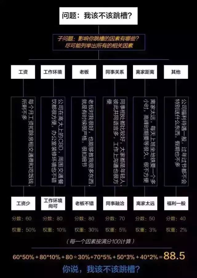 1.我是不是把全部的大概因素都思量到了,有没有遗漏的?如果有,再去找。2.这些因素之间有没有相互重叠的部门?如果有,举行去重。举个例子,比如你如今遇到的标题是:“我该不应如今跳槽?”那么对这个标题的分解可以如下图所示: ) |4 w) i0 V* K# S