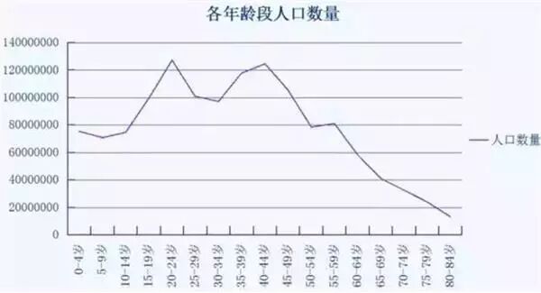 ! w: B6 D" \4 o$ s" h" x' X' e纵轴为生齿数量,横轴为年事分段,5岁为一档,从0-4岁开始,直至80-84岁,之后年事段的人数比起总生齿数太少,加之中国人均匀寿命为73岁,故略去不表。8 D6 t! N) n0 b# E