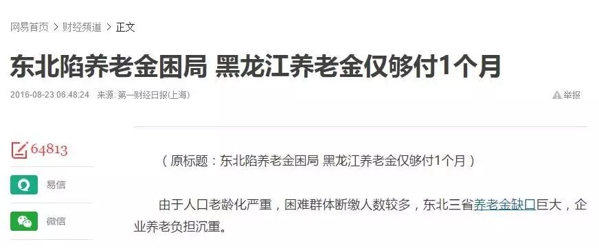 现在,养老金已经连续十二年增长。官方的数据是养老金现在每年仍有盈余,但无论官方照旧民间,全部人都不得不正视如许一个毕竟:自2012年开始,养老金的付出连续高于其增长收入,而操持生养带来的“恶果”正在逐年显现,早晚有一天,我们的养老金会入不敷出。毕竟上,由于各处国企(国企职工养老金汗青欠账题目最为严峻),加之恒久以来生齿净流出,东三省的养老金早已经入不抵支,养老金缺口逐年增大。2016年中旬媒体就曾曝出“黑龙江省养老金仅够付1个月”的惨烈毕竟。 没办法,只能是中央财务贴补。可这也不是个恒久的办法啊,怎么办呢?