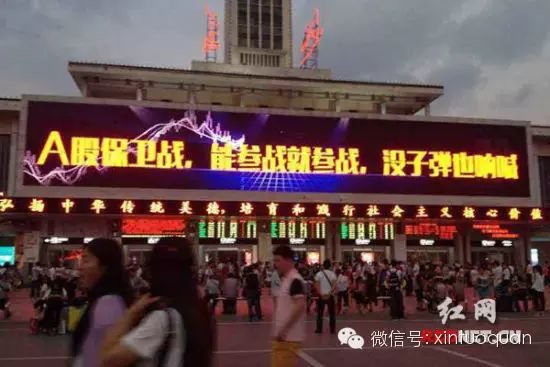 * \/ \; y) f( e1 I8 o5 P- s. R7月6日晚,长沙火车站进站口上方电子广告屏出现巨幅字幕,为股市加油。