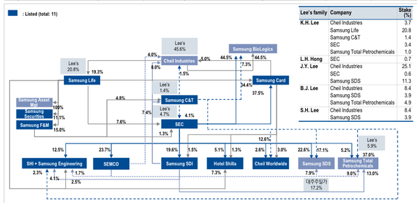 我们看三星团体各企业间的持股就可以看出,持股比例都比力大。) ?7 e# I% z5 ~% T