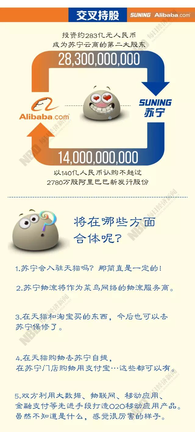 京东上周入股永辉超市,阿里紧接着本日公布入股苏宁,中国B2C范畴老大和老三联手抢头条,让刚领证的东哥情何以堪,就不能让人好好地度蜜月吗?1 F2 c! W& p0 v! Y5 g% [