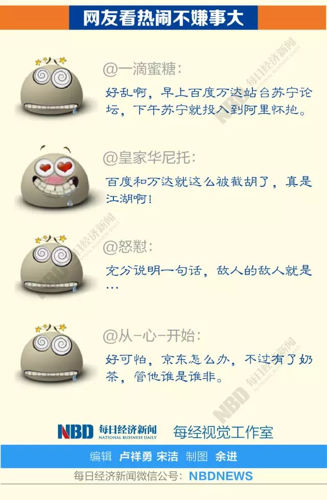本日上午有人传阿里入股苏宁,也有人说万达加百度一起入股苏宁。从宏观上判定,很多人会更倾向后者。由于能包管中国电商零售市场上不绝有人在搅局,不绝有人竞争。有竞争的最大更大利益是百度加万达进来,京东保有竞争上风,苏宁创新有了相应的路径。以是,如果阿里和苏宁攀亲,对阿里是有利益的,但是对苏宁,就算是有利益,大部分也会被阿里分走吧。) P% z# U1 E( z- i! W