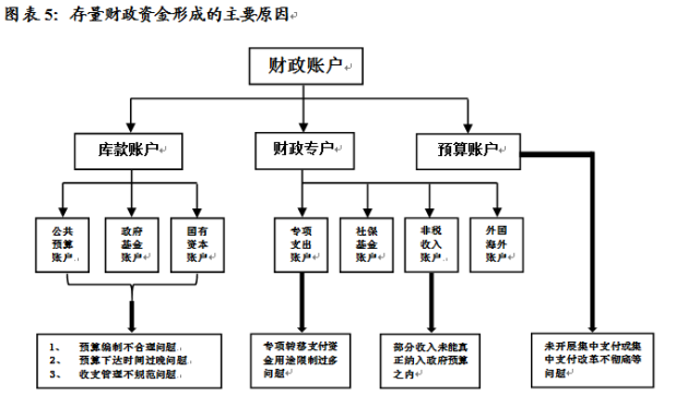 一、存量财政资金的来龙去脉1、什么是存量财政资金?l 从资金的存放地点属性看,存量财政资金重要分为三部门:存放在人民银行的库款账户资金(库款资金)、存放在商业银行的各类专户资金(专户资金)和预算单位账户的资金(预算资金)。l 1)库款账户(库款资金)。库存资金重要包罗:公共预算资金、当局性基金预算资金和国有资源策划预算资金。l 2)财政专户(专户资金)。包罗如下四类账户:专项付出财政专户(专支账户)、社会保险基金财政专户(社保账户)、非税收入收缴财政专户(非税账户)和外国当局&国际金额构造贷款赠款财政专户(国外账户)。l 3)预算账户(预算资金)。固然我国绝大多数地区都开展了会集收付改革,但仍有部门地区没有开展此项改革,该部门地区的预算单位若要利用资金就必须起首将资金拨往其在商业银行开立的账户,由于资金的拨付和利用存在时间差,从而造成了资金闲置。