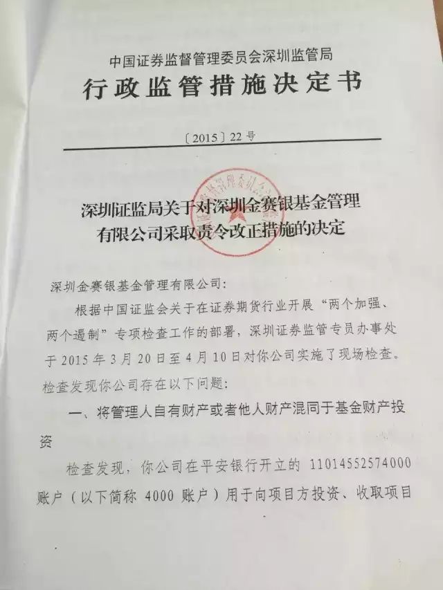 迩来,一家名为深圳金赛银基金管理有限公司陷入60亿元兑付危急中,金赛银负责人王维奇跑路,客户的几十亿资金无处追讨,无处申说。小黄人的一位朋侪也深陷此中,苦不堪言。她说,深圳经侦不管不问,拖着不办,人居然也没抓到。而羁系机构证监会在五月份就金赛银的庞大违规题目发布过行政羁系步伐决定书,然而金赛银继续行骗1个多亿资金,证监会至今也无进一步动作。(下图为证监会行政羁系步伐决定书部分)) a+ n) J5 Q g