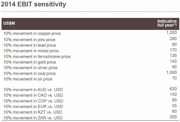 / {9 e8 X- r$ [0 m- D) l而嘉能可拥有极大的铜风险敞口。该公司在2013年的年度财报中表现,如果铜价下跌10%,那么公司的税息折旧及摊销前利润(EBITDA)就将被抹去12亿美元。同时,按照前银河期货首席宏观经济顾问付鹏的见解,根据嘉能可2014年的财报,如果一揽子汇率对美元贬值10%,那么汇率颠簸对嘉能可的税息折旧及摊销前利润(EBITDA)就将被抹去11.4亿美元!而从2014年到现在,一揽子货币对美元匀称贬值均凌驾了20%,这意味着至少汇率对EBITDA敞口至少这两年被抹去了25亿美元。