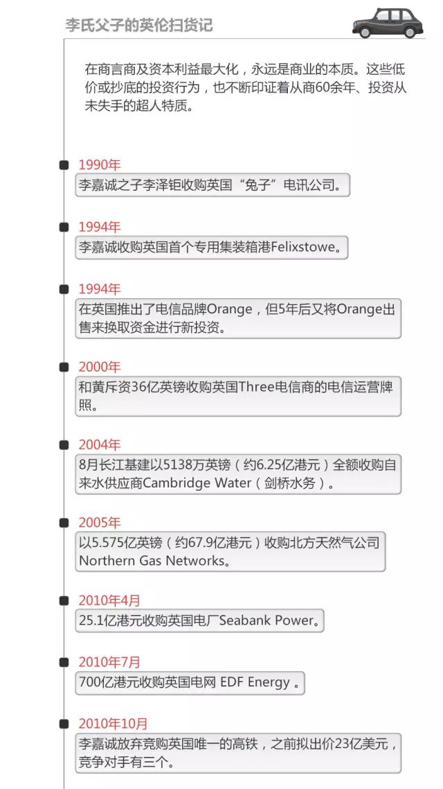 0 W3 w8 {: ^% g0 F比年来,李嘉诚套现国内部分资产,进而频仍投资欧洲,惹来不少议论。据媒体报道,李嘉诚在欧洲投资告急包罗基建、电信、零售行业、电网、水、管道燃气等范畴,此中英国是“主战场”。现在,英国天然气近三成市场、电力分销四分之一市场和供水约5%的市场皆由李家控制。别的,港口、机场与金融市场业务也在李氏收购范围之内。, ^9 W; E1 `- V- e% Q: A: P! E. a