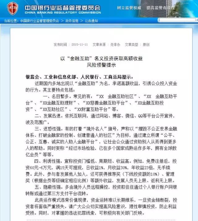 银监会、工信部、央行、工商总局于11月11日发布团结公告《以“金融相助”名义投资获取高额收益风险预警提示》。公告称,近期国内多地出现以“金融相助”为名,答应高额收益,引诱公众投入资金的活动。“此类运作模式违背代价规律,资金运转难以长期维系,一旦资金链断裂,投资者将面临严肃丧失。”* Z) p" Q2 Z3 }# l# l0 U- D