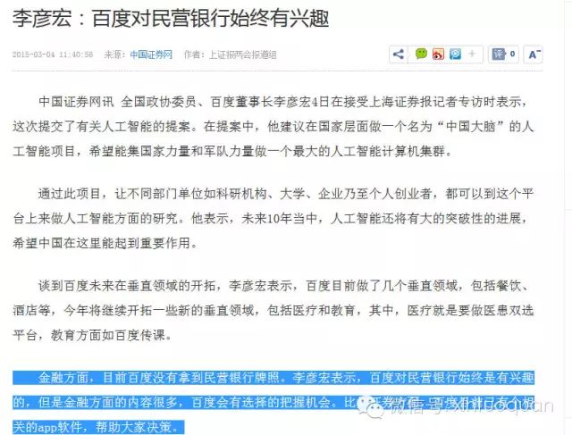 9 s( z/ n5 S }3 Z% r5 C" V早在2014年,百度CEO李彦宏就在到场中国人大的集会时就表现:“互联网即将颠覆的行业中包罗金融业。百度现在正在申请包罗付出在内的多个银行牌照”。本年3月,李彦宏在继承媒体专访时表现,百度对民营银行始终是有爱好的,但渴望到场发起一个民营银行。金融方面的内容很多,百度会有选择的把握时机。9 E4 s0 u1 Q3 m; Q' C