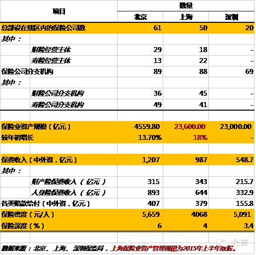 A9 `" l* l5 C) L" f4 [保费收入北京是上海的1.22倍,是深圳的2.2倍。除了保费收入,保险深度和密度是衡量一个地区保险市场成熟度的量化指标。停止2014年底,发达市场人均保险付出为3666美元,人民币21996元。保险密度第一的是瑞士,第二是卢森堡,第三是丹麦,美国第十。