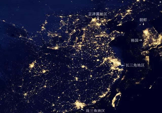 3 l: n; V# ~ f△NASA在2012年拍摄的地球夜景局部,你可以看到长三角、珠三角和京津冀地区夜晚灯光分布的差异。趁便奉送朝鲜半岛的彩蛋 k% D& x, S, O) M& Q- B: c b" O* N