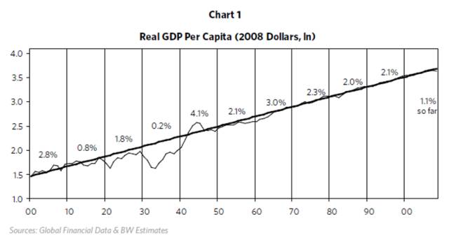 如下图1所示,已往100年来,真实人均GDP以略低于2%的均匀速率增长,且厘革幅度都是在2%左右。(若想相识差异国家的经济在肯定时期内怎样发生厘革以及厘革的缘故原由,请拜见相干陈诉《论国家经济成败的缘故原由》)。这是由于人们的技能随着时间的推移不停发展,生产率和生存标准也随之提拔。正如本图所示,这个趋势线从恒久来看只有相对非常小的厘革。纵然是在1930年代的大荒凉时期,它的厘革看起来也相称小。因此,我们确信随着时间的推移,经济将回到正常轨道上。然而,短期来看,这些偏离趋势的厘革大概好坏常显着的。比方,通常在荒凉中,现实经济从波峰到波谷降落约莫20%,金融财产粉碎水平通常凌驾50%,而股票代价通常降落80%左右。对于那些在荒凉刚开始时获取金融财产的人来说,金融财产的丧失通常大于这些参考数字,由于还存在财产拥有者的大量转移。