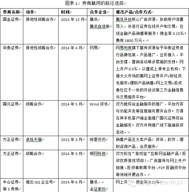 既然互联网已成为与现实天下相雷同的又一个空间,券商触网最简单的办法就是把业务部的业务部门或全部搬到网上来。至于具体利用方式则有许多种,像方正证券直接在天猫开设旗舰店,售卖投顾服务,而大部门券商则选择与互联网巨头缔盟或联姻的方式来分享互联网企业巨大的用户群。范例的有中山证券推出企业qq号,直接从qq用户端分流;国金证券与腾讯签订排他性战略互助协议,取得腾讯公司焦点广告资源,导入用户举行证券在线开户和买卖业务,在线金融产物贩卖等服务。国金证券同时还推出了佣金率为0.25‰的佣金宝产物。国元证券与wind、方正证券与顺网科技、华泰证券与网易均接纳了雷同的战略与方案。