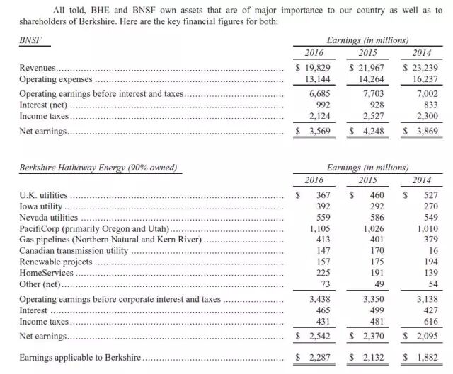 / J5 k4 ~3 |* A4 y' A4 D51、我们的BNSF铁路跟伯克希尔能源(BHE),我们90%控股的公用古迹业务单元,拥有特别告急的特性,使得他们跟伯克希尔其他的业务有较大区别。以是,在这封信中,我们把他们单独列出来。客岁,他们两家占了伯克希尔33%的税后业务利润。3 S. I! j/ U: ^. h