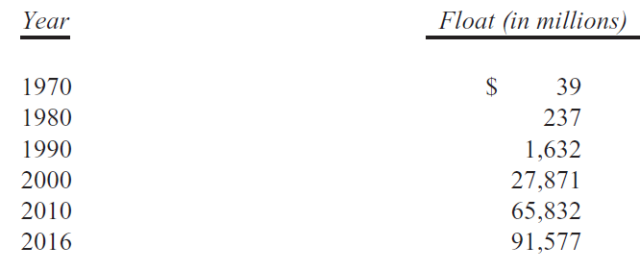 1 d' w3 q/ O8 t2 r2 t5 L$ P29、我们当时收购P/C这块业务的一个缘故起因是它的金融特性:P/C保险公司收保费在先,理赔在后。非常情况下,理赔的时间跨度可以长达几十年。“现付后赔”的贸易模式使得P/C保险公司持有大量现金。于此同时,保险公司可以根据他们自身的长处来投资这些钱(我们称之为“浮动金”)。只管保单来来每每,保险公司手头持有的浮存金通常是稳固的。结果就是,随着我们的业务增长,我们可以动用的浮存金也越来越多,具体如下:3 X. \1 S1 U0 S1 T; `8 n- v