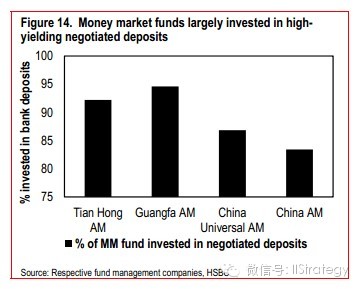 因此,线上金融平台的增长开始威胁银行依赖息差生存的传统业务模式。本陈诉中,我们观察了4家线上钱币市场基金公司,发现89%的资金都是以协议存款的情势放在银行(见图14)。这四家基金公司的匀称存款时间为53天(见图15)。由于投资者可以随时赎回,因此这些基金公司存在肯定的时间风险。这就是钱币市场基金的收益率明显高于活期存款的缘故原由。