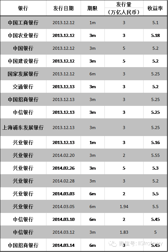作为利率市场化工作的一部门,央行于2013年12月在银行间重新启动定期存单生意业务。2013年12月12日和13日,10家银行共发行了340亿元定期存单,包罗1月期、3月期和6月期(见表3)。自此之后,银行每年须要向央行递交定期存单发行操持,然后即可发行。比方工商银行、中信银行以及兴业银行宣称,他们操持本年各发行1000亿元的定期存单,而交通银行、中国建立银行以及中国招商银行也操持发行800亿元的定期存单。(泉源:路透社,2014年3月19日) 8 f5 g7 H) W$ @1 L# x/ b% m