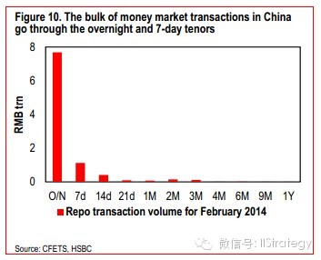 【图17】回购市场活动性优于SHIBOR市场 比方,2014年春节假期之前,7天回购利率和7天SHIBOR利率都为4.72%。然而3个月期回购利率是6.7%,而SHIBOR是5.6%(见图18)。一个广泛认同的观点是,缺乏竞争的定价机制使得SHIBOR和回购利率相比偶尔过高,偶尔又太低。同时,央行不停试图推动银行继续SHIBOR也早已不是秘密。2013年央行发行定期存单(CD)时,其定价以SHIBOR为参考就充实体现了这一点。 8 P q" g0 {$ m