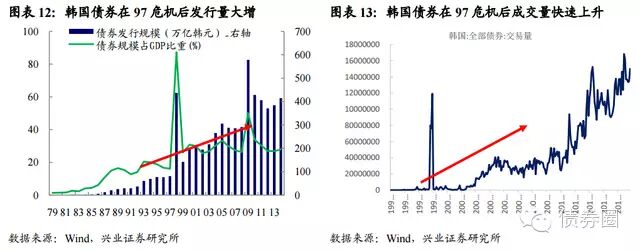 1997 年发生亚洲金融危急,韩国政府会合处理处罚银行和企业债券违约标题,对违约债券通过多种证券化本领举行体系地改造。通过大量发行政府债券对银行资源举行调解和重组,促进政府债券的发行数量的提拔。在此期间,由于信托投资公司的大量涌现,加速扩张了韩国公司债券发行量增长。韩国政府发行大量国债来补充危急时期产生的巨大财政赤字。而且,危急后政府积极改善企业的公司管理布局,淘汰了交织持股和交织包管,进步了公司债的质量。
