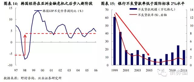 刚兑突破后,韩国资源扭曲得到改正,99 年后经济增长开始迈入新的发展阶段。韩国在 97 年亚洲金融危急突破刚兑后,国内过剩产能被大量镌汰,韩国经济增速在履历 98 年断崖式下跌后,于 99 年开始大幅反弹,在履历了市场出清和羁系放松后,市场的手渐渐开始在韩国的金融资源分配中发挥底子性作用,韩国经济发睁开启了新的发展阶段(图表 14)。同时,由于韩国债券市场的快速发展,市场主体的债务风险得到了充实有用地分散,此时固然少了“国家刚兑”,但银行的坏账在改革步伐和经济企稳向好的情况下不停降落,并从2004 年开始维持在国际警戒线 2%以下(图表 15)。 ' P$ U; ~8 u4 _& d7 W8 b- U' P