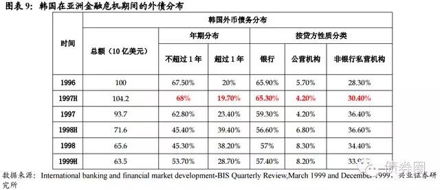 8 N/ {- V) `7 T0 F财阀企业债台高筑导致银行坏账飙升,韩国资源账户开放导致银行外债攀升叠加外洋股权资产缩水,银行资产负债表开始塌陷。 $ H9 C. z2 k8 h# v6 h# G
