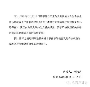 据相识,宋鸿兵在山西省太原市演讲遭遇部门投资者的围攻,疑与其为昆明泛亚有色金属生意业务所站台有关。而且宋鸿兵厥后被迫手写致歉书,并称泛亚资金出现标题,大概跟股票市场有关。+ Z+ r$ n2 {! ^, N: E# g