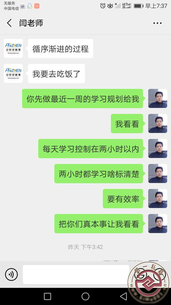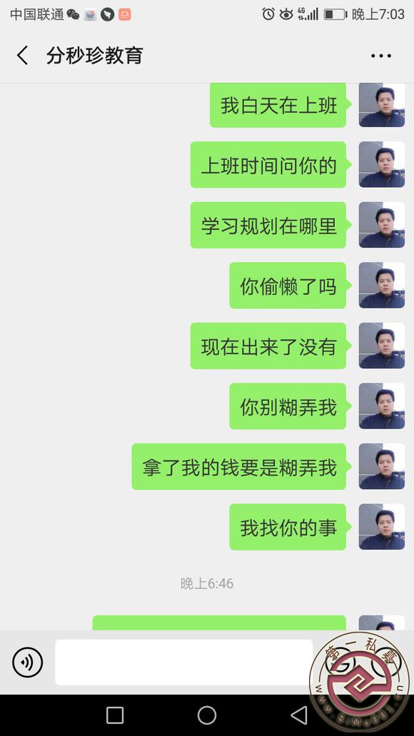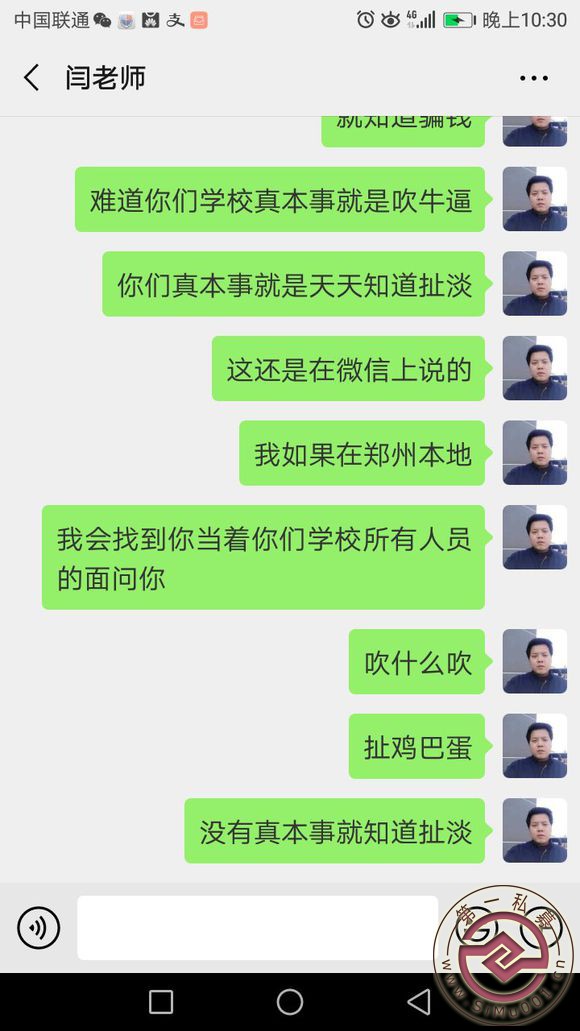 ; C9 H# F6 p5 f8 M; ^1 [闫老师基本上躲起来来了,我微信联系闫老师要闫老师兑现一天一俩小时,可以拿证书按照老师的教学计划,我让他做教学计划,他装失踪了,还有那个班主任我让她做教学计划别糊弄我,要提高效率,她也躲起来了,现在他们俩微信不理我了,他们学校非常无耻,在他们失踪时,分秒珍其他两个老师还给我推荐他们总裁密训班,让我转班学习,说我之前那个学习方法根本拿不了证书,我说你们这不是承认我受骗吗,拿不了证书我来你们这里学什么。好无耻的学校。那两个让我转班的老师一个是常老师一个是张老师,感觉他们学校一点信用都没有。现在常老师已经把我微信删了,张老师不回我微信,也装失踪。下面给大家上传聊天记录,有些部分我在文章里面没有打出来,在聊天记录里面有全国人民看看他们无耻的样子吧. V H4 ]: l0 U- {* U+ s, ~