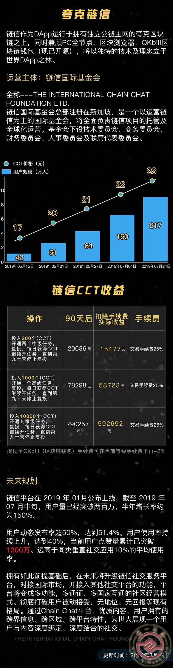 抢占早期的市场很重要,现在已经一天四五万的会员量注册了,陈佳陈老板就是做区块链技术出身的,所以对区块链很懂行,也把【链信】防刷技术做的也特别好,所以当智慧晶 趣步都跌价格的时候 。链信通证价格还在稳定上涨。别的项目丝毫不影响我们链信 通证cct。我们链信有自己的公链,区块钱包,otc交易所,区块浏览器, pc节点挖矿!这些都是真区块链必备的条件!1 f: U& E1 y+ z* S