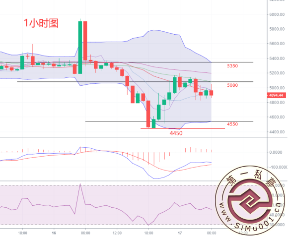 5 [! G- Q% m: B. }从盘面可以看到,目前小时图布林带缩口,K线基本处于小时图布林上轨与下轨之间,附图指标来看,小时图和四小时图都处于超卖反弹阶段,个人认为短期内是有反弹的行情的,不过也别急着就抄底,从月线图来看,下方还有明显的下行空间,下方支撑在2018年熊市最低点3150附近和月线布林下轨2200附近,所以想抄底的个人建议等一等或者分批轻仓进场。那么短期来看的话,自跌至3800一线反弹后,比特币始终没有破位6000关口,所以这一线个人建议当做一个大的压制关口对待,目前K线受小时图MA30均线5080和MA60均线5200附近压制,防守压制看小时图布林上轨5350和四小时MA30均线5450附近,下方重点关注小时图布林下轨4550附近和昨日低点4450附近的支撑,防守支撑看前面低点3800附近,今日操作上个人建议先围绕4450-5450这个区间操作,破位再顺势操作即可,注意控制好风险。