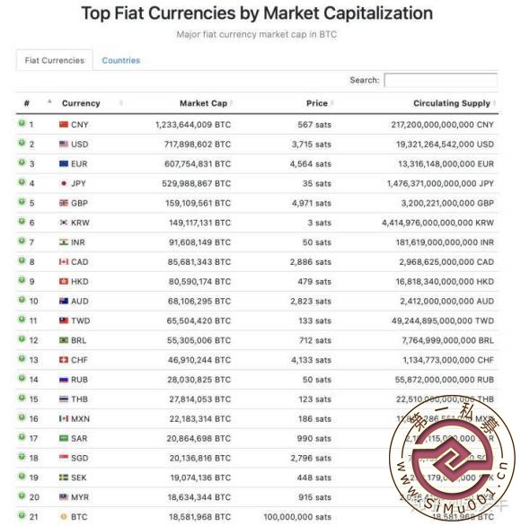 根据fiatmarketcap数据显示,按照BTC计价,“全球通用货币”比特币的市值已经为18,581,968 BTC,与全球各国法币相比,位居21位并且即将进入前20位,但与排在第一位和第二位的人民币和美元相比,比特币的规模还相差甚远。: \. @2 b8 z. i( }2 X