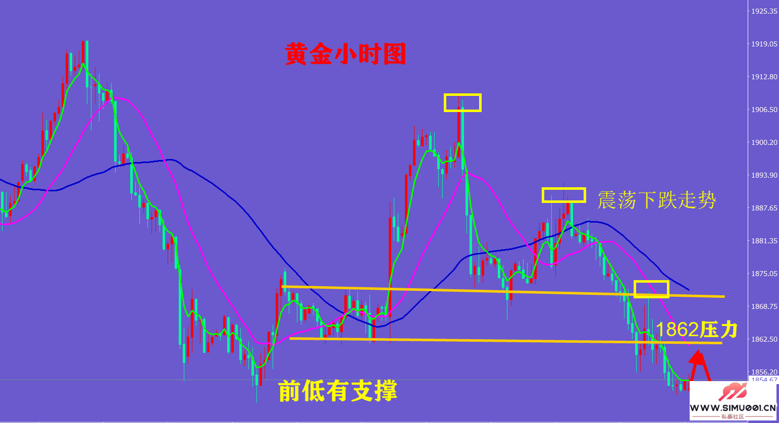 - Q% c1 X3 D) M) E& q 最近的压力位置是昨日美盘反弹的压力1862位置,以及金固昨日提示的1872。这两个位置是我们今日做空的重要防守。因为跌至了前低支撑,早盘等反弹后再空,1860附近空!