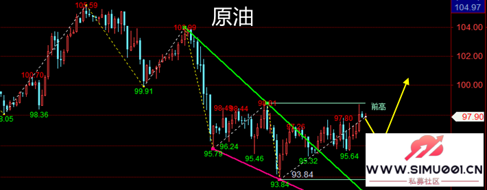 * i! a7 j8 z2 r原油方面:上周五原油震荡回落下探95.3附近,在反弹上探97.8附近,在回落下探96附近,在反弹上探98.7附近,收盘97.7附近,原油日线级别收线小阳线,周线级别收录一根带有下影线的小阴线,同时油价也触及前期3月15日的低点价位附近,结构上前期的105.6-93.8走出完美的5波下跌走势,周四油价在93.8一线企稳反弹,已经终结掉了C浪下行走势,迎来93.8-97.3反弹走势,看作上涨的第一波,日内价格回落95.2刚好是黄金分割50%的位置止跌完成了回调的第二波走势,同时也迎来的第三波的上涨走势,那么95.2-98.7刚好完成了上涨的第三波延续,目前需要留意第三上涨浪是否延续。