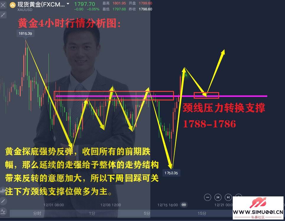 从黄金4小时周期来看,目前行情处于探底迅速拉升阶段,由于近期市场消息面导致,黄金底部已经探明,那么今日行情可能继续延续多头行情,由于黄金走出急速反转,市场更可能出现短回踩后,持续拉升的行情。所以下周重点关注小周期回踩支撑,如有短线调整,可参与多单。