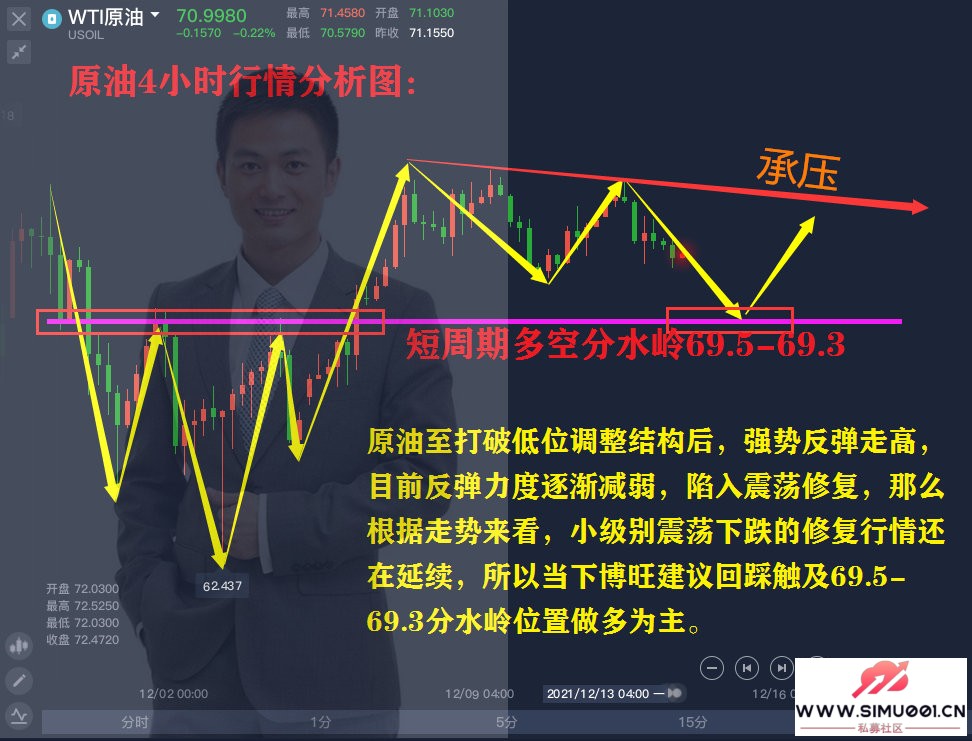 原油4小时走势,近期原油陷入僵局,价格在经历一波触底反弹行情之后,处于横盘整理态势,虽然上周强势反弹了一波,但并未扭转弱势的格局,整体走势还是较弱。日线级别,布林带开口向下,布林中轨在K线上方形成强压制,价格连续几日向上均未能突破中轨阻力,昨日开盘价格小幅反弹后触及中轨快速回落,说明上方阻力强劲,短线有继续下行风险。4小时,布林带有向下开口迹象,价格横盘震荡,短线走势震荡偏空,日内价格如果继续下行,打开布林下轨,那么短期有再次向69.6一线试探的风险。日内操作思路暂时先看空,大趋势依旧关注图中多空分水岭看多。上方关注72.6附近阻力,下方关注69.5一线支撑。3 ?. l5 B# Q5 d# e5 G