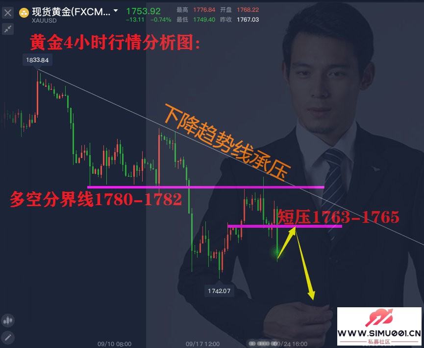 黄金4小时探高收低后显示下行趋势线的阻力强度,同时也是短期空头的临界点。若不突破趋势线那么下行趋势未改变,加之昨日受美联储在最新的决议中加息比预期的时间提前及11月减码的双重利空影响,黄金呈现冲高回落,从日线的整体节奏来看,空头向下的意味延续的概率较高,同时4H周期也维持着空头向下但短线出现于超卖区域,所以今日耐心等待反弹入场高空为主,快速回踩短多为辅。 , R# m, y& k. G; q& Z5 j* s