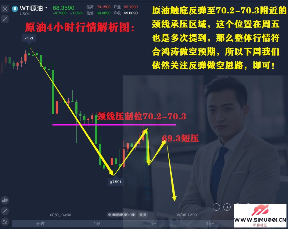 综合而言:周一原油利用思绪上李鸿涛发起,反弹高空为主,回踩做多为辅。上方起首关注69.3-69.5一线,其次关注70.2-70.3一线强压位,那么下方关注67.3-67.4一线4小时次低点。
