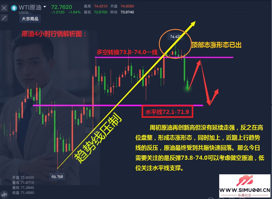 2 A" s: [6 W; }. Q1 k/ L/ a 参考思绪二:早间回踩72.4-72.3做多,止损71.9,目的72.8-73.5-74.1附近; & q4 R' z# h4 h+ O- Y