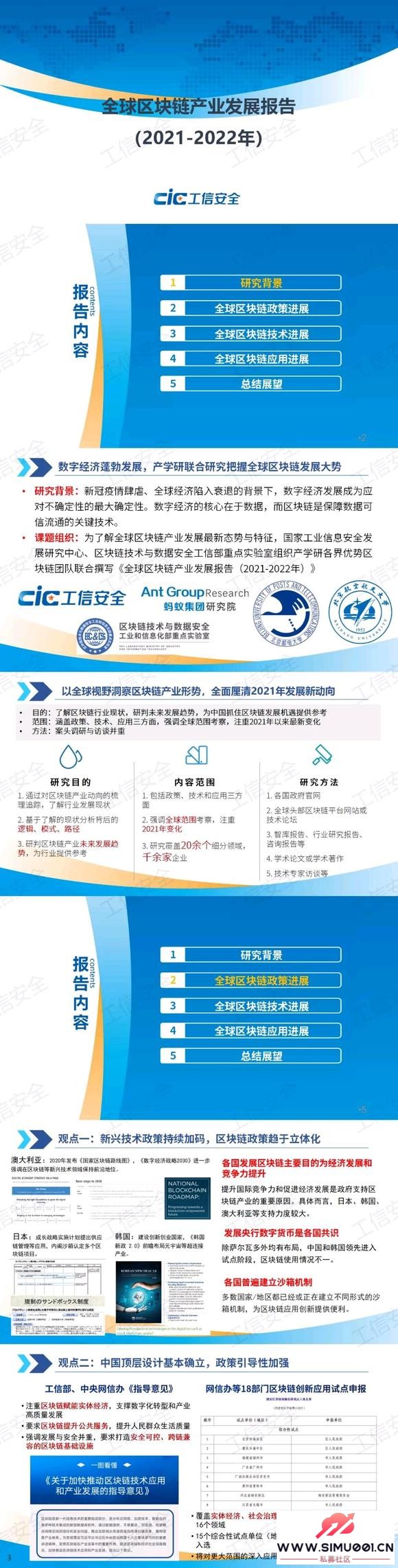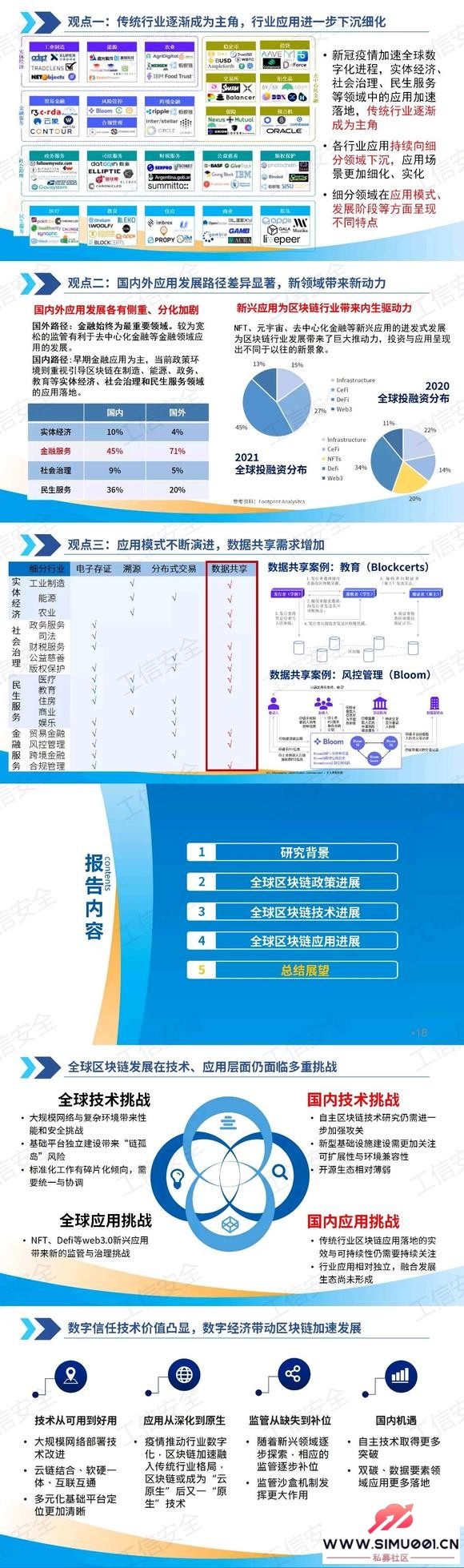 报告通过对10余个国家/地区、20余个行业细分领域以及3000余家企业的全方位、立体化研究,系统梳理了世界各国在区块链政策制定、技术突破、应用落地等方面的最新动向,研究了背后的逻辑、模式、路径,并对未来发展趋势进行展望。报告指出,区块链产业发展机遇与挑战并存,国内亟需加强自主技术的攻关与行业应用的融合发展。同时,区块链技术正在从可用走向好用,呈现云链结合、软硬一体等发展趋势。疫情推动各行业数字化转型的背景下,区块链正与传统行业加速融合,并将在双碳、数据要素等领域出现更多的应用落地。3 ?: y. E7 b! l