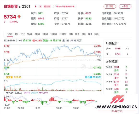 ) R; T8 {) T ]; U当前,白糖期货主力合约是sr2301,开盘价5711元,前结算价5727元,截止本文发布,最新价格为5734元,涨跌幅0.12%。价格行情走势图如下所示:) O9 a0 }3 q8 q" B8 @